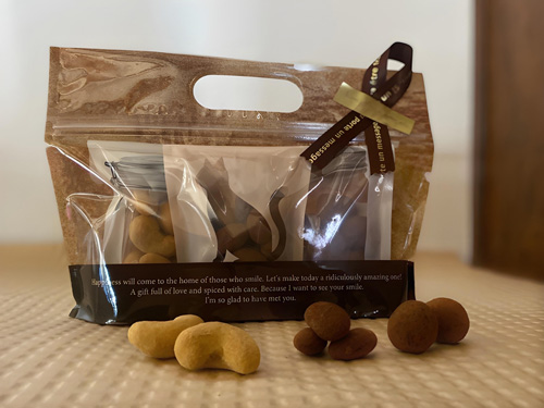 3種のナッツチョコを、おしゃれなラッピング袋に詰め合わせました♪
